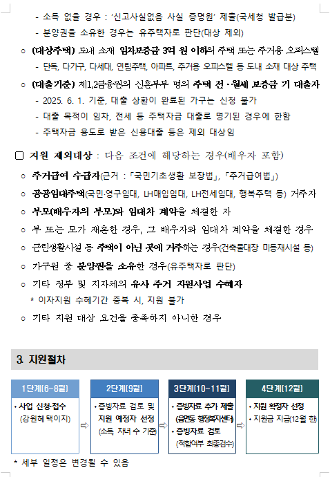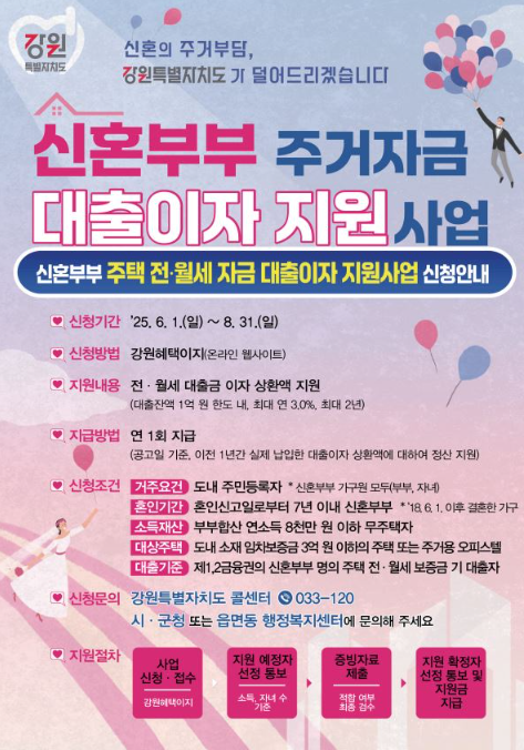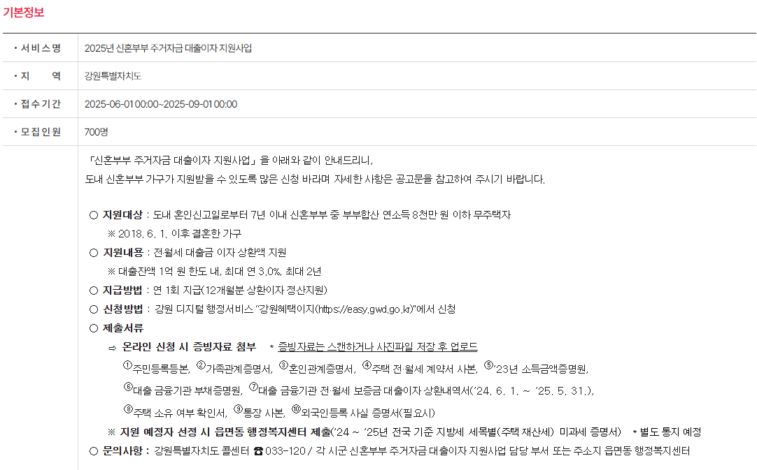 | 신혼부부 주거자금 대출이자 지원 | 동해시 신혼부부 포함, 전월세 대출금 이자 상환 지원 | 2025-06-01 ~ 2025-09-01 | 033-120 |