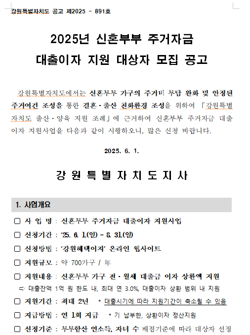 2025년 현재 동해시 신혼부부를 포함한 강원도민을 위한 핵심 복지사업들을 아래와 같이 정리했습니다. 특히 ‘신혼부부 주거자금 대출이자 지원’은 동해시 신혼부부 전세자금 부담을 덜 수 있는 기회입니다.